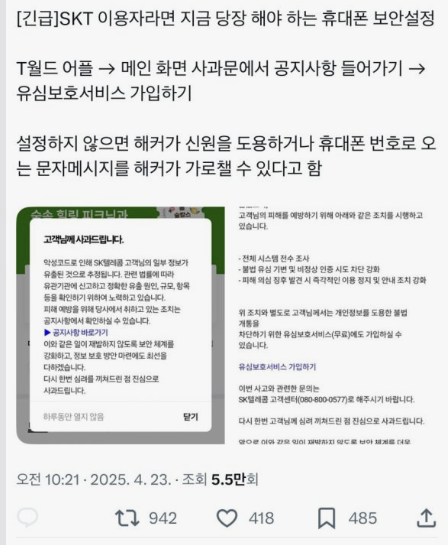 이러한 사태로 인해 skt 유심 교체가 급부상했으며, SKT는 전 가입자 대상으로 skt 유심 무상 교체를 진행하기로 결정했습니다. skt 유심 교체는 고객 신뢰 회복과 2차 피해 예방을 위한 조치로, skt 유심 보호서비스 가입도 권장하고 있습니다.
