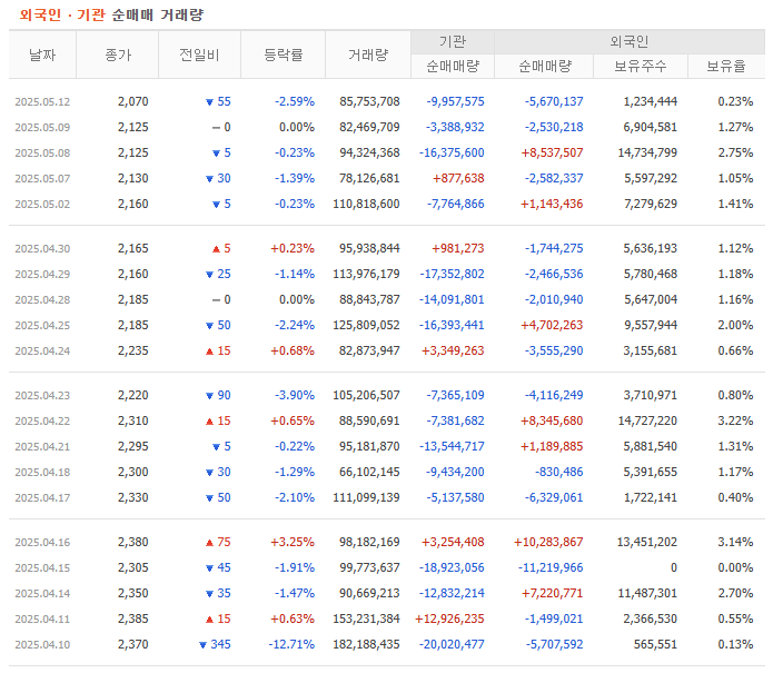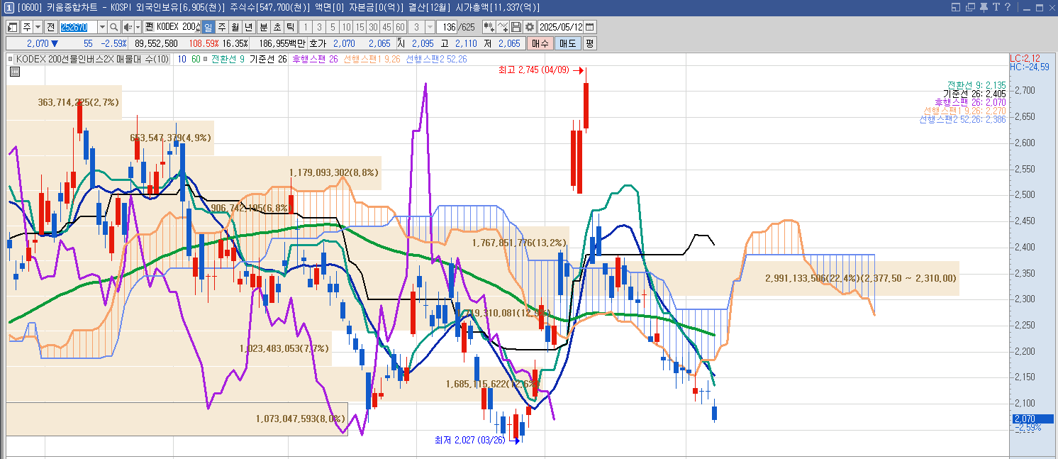 - 최근 고점: 2,745원 (4월 9일) → 이후 강한 조정 구간
