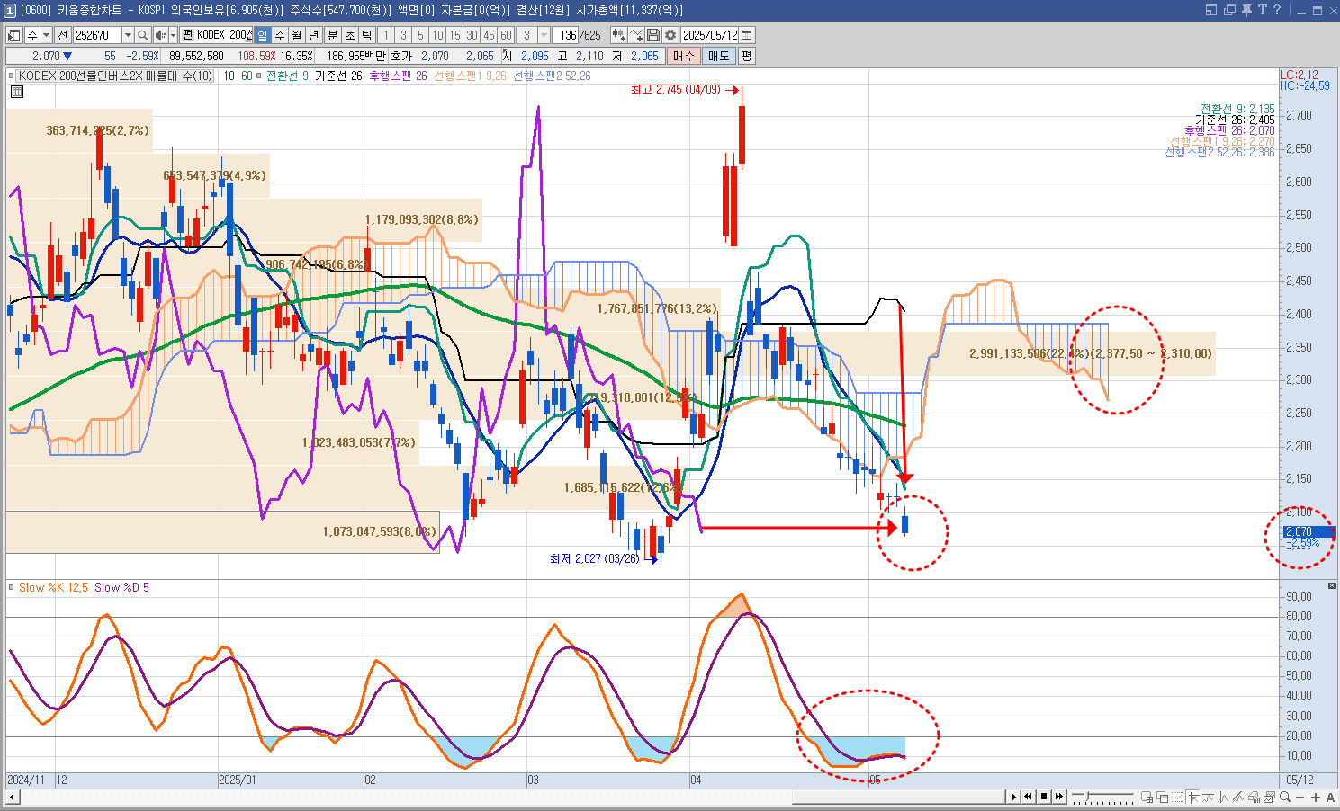 - 현재가(2,070원)는 단기 저점권(2,027원)과 가깝고, 스토캐스틱이 과매도 구간